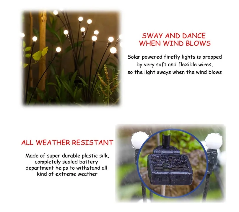 Sada venkovních solárních světel je skvělou dekorací pro vaše terasy, dvory, trávníky nebo chodníky. Světla vytvářejí příjemnou romantickou atmosféru a jsou odolná proti vlhkosti.