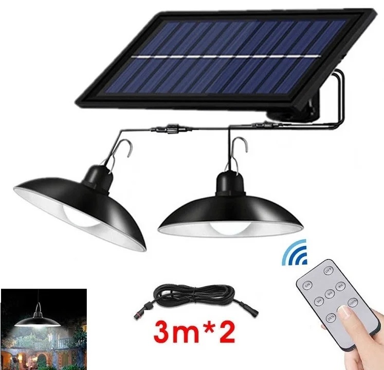 Solární osvětlovací systém obsahuje 2 x lampu s praktickým háčkem pro zavěšení. Je určený jako funkční dekorace k osvětlení zahrad, pergol, přístřešků, atd. Osvětlení se nabijí ze solárního panelu. Lampu lze ovládat pomocí dálkového ovladače. Lze jí i pomocí on/off vypínače na zadní straně solárního panelu vypnout/zapnout.
