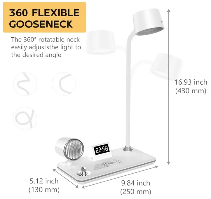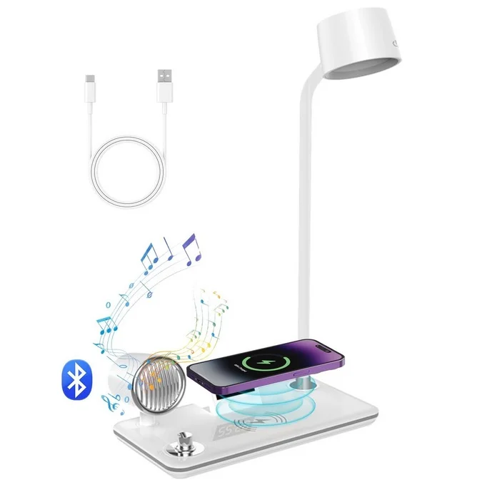Multifunkční stolní lampa 4 v 1 je ideální pro domov i kancelář. Nabízí nejen kvalitní osvětlení se třemi teplotami barev, ale také bezdrátové nabíjení, Bluetooth reproduktor a digitální budík. Vše v jednom zařízení. Díky flexibilnímu husímu krku si ji snadno nastavíte podle potřeby.