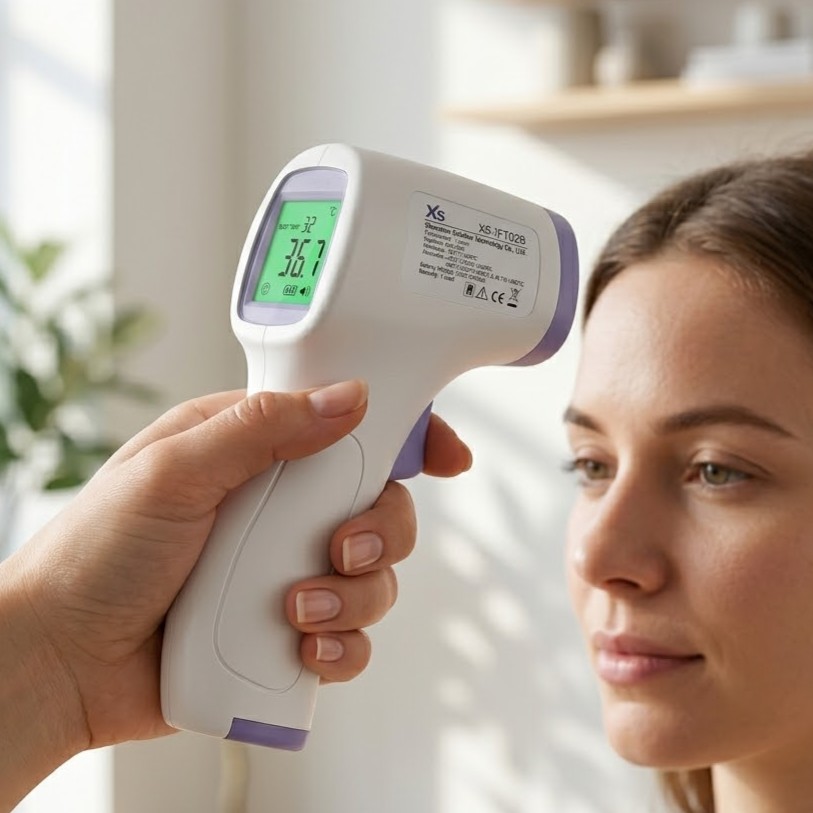 Rychlý a bezpečný teploměr, jehož použití je jednoduché. Stačí stisknout tlačítko a během 1 sekundy víte přesnou teplotu. Měřicí vzdálenost mezi teploměrem a čelem musí být 5-15 cm. Je vhodný pro všechny věkové kategorie – kojence, děti, dospělé i seniory. Jakmile detekuje vysokou teplotu, zazní zvukový alarm.