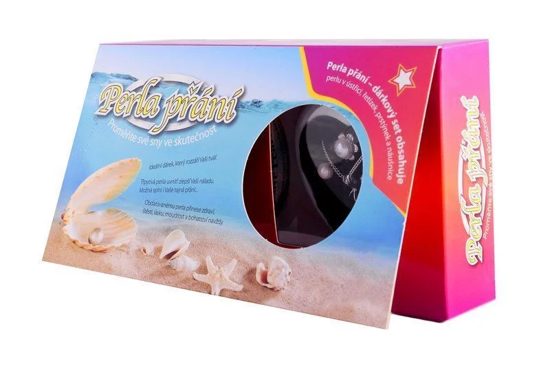 Perla přání je překvapující dárek pro ženy. sada obsahuje perlorodku, jednu barevnou perlu uvnitř, klíckový náhrdelník na perlu, kterou z mušle vytáhnete, dále pak náušnice a prstýnek.